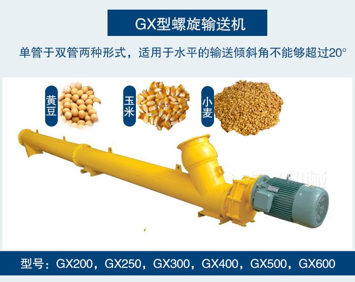 GX型螺旋輸送機(jī)是較老的螺旋輸送設(shè)備,其有單管于雙管兩種形式,適用于水平的輸送傾斜角不能夠超過20°??奢斔鸵恍K狀的(小塊狀物料)例如:麥子,玉米,黃豆等糧食。