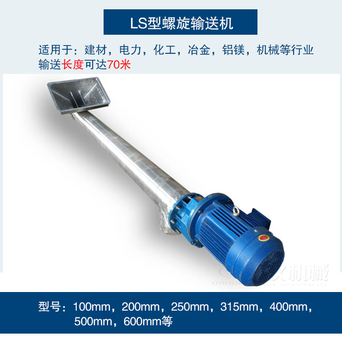 型號:LS型螺旋輸送機(jī)以管徑為型號:100mm,200mm,250mm,315mm,400mm,500mm,600mm等型號。