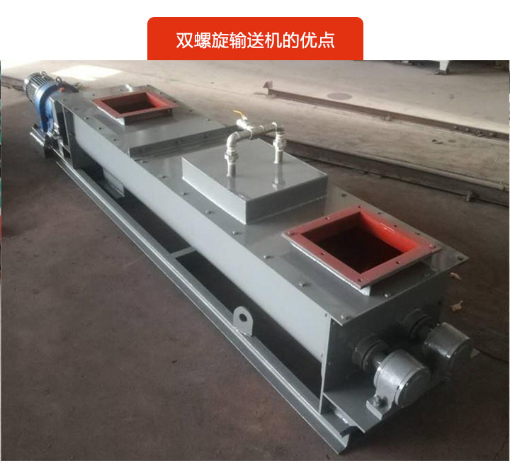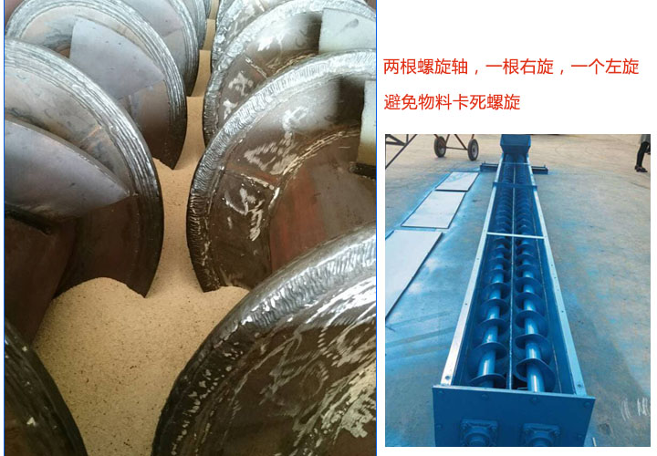 雙螺旋輸送機擁有兩根螺旋軸,旋轉(zhuǎn)方向相反(一根右旋,另一個左旋),能有效避免物料卡死螺旋,輸送中不會出現(xiàn)卡料和堵料的現(xiàn)象。