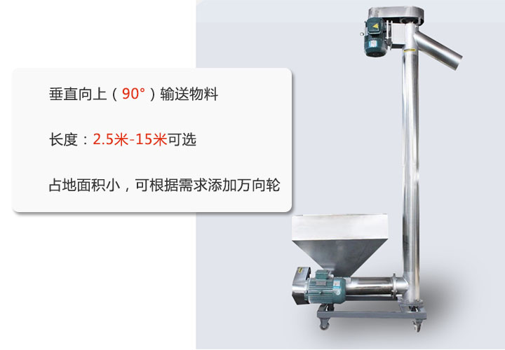 垂直螺旋輸送機用于解決需要垂直向上(90°)輸送物料的難題,其長度2.5米-15米,大家可根據需要選擇長度;相比普通螺旋輸送機,該款設計更好的節(jié)約了占地面積,也可根據場地需要添加移動輪,方便來回移動。