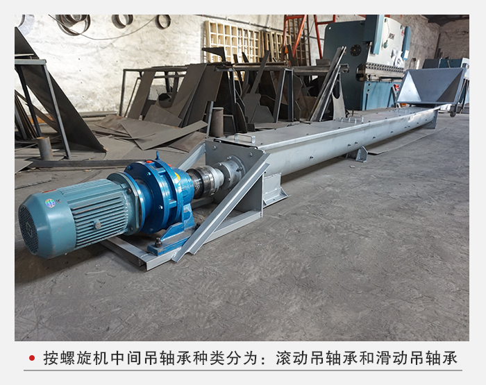 按螺旋機(jī)中間吊軸承種類(lèi)分為:M1—為滾動(dòng)吊軸承,采用80000型密封軸承,軸蓋上另有防塵密封結(jié)構(gòu),常用在不易加油,不加油或油對(duì)物料有污染的地方,密封效果好,吊軸承壽命長(zhǎng),輸送物料溫度≤80℃(訂貨時(shí)可不注明)。M2—為滑動(dòng)吊軸承,設(shè)防塵密封裝置,常用在輸送物料溫度比較高(>80℃),或輸送液狀物料