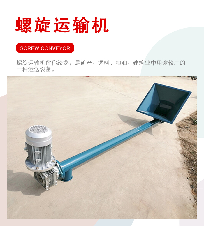 螺旋運輸機俗稱絞龍,是礦產(chǎn)、飼料、糧油、建筑業(yè)中用途較廣的一種運送設備,從運送物料位移方向的角度區(qū)分,螺旋運輸機分為水平式螺旋運輸機和筆直式螺旋運輸機兩大類型,首要用于對各種粉狀、顆粒狀和小塊狀等松散物料的水平運送和筆直提高。