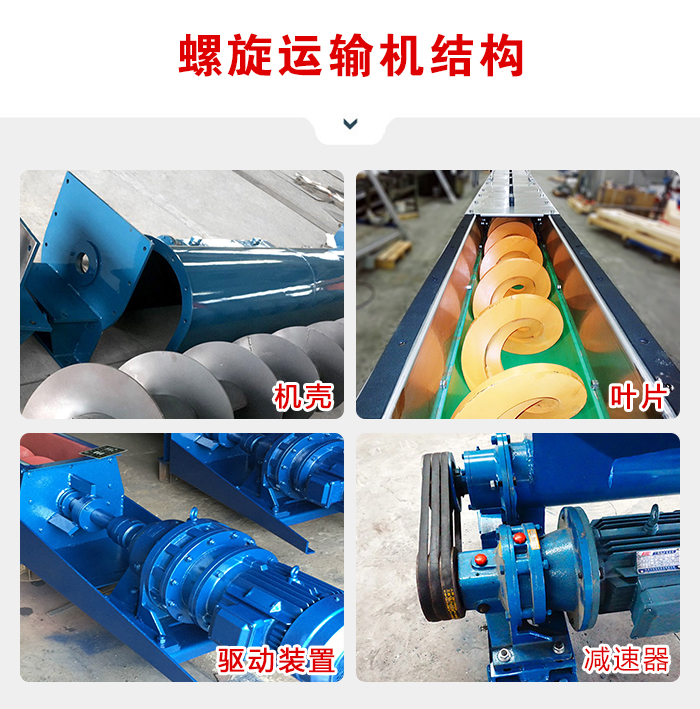 螺旋運輸機一般由運送機本體、進出料口及驅(qū)動裝置三大部分組成;螺旋運輸機的螺旋葉片有實體螺旋面、帶式螺旋面和葉片螺旋面三種方式,其中,葉片式螺旋面應用相對較少,首要用于運送粘度較大和可壓縮性物料,這種螺懸面型,在完成運送作業(yè)過程中,一起具有并完成對物料的拌和、混合等功用。